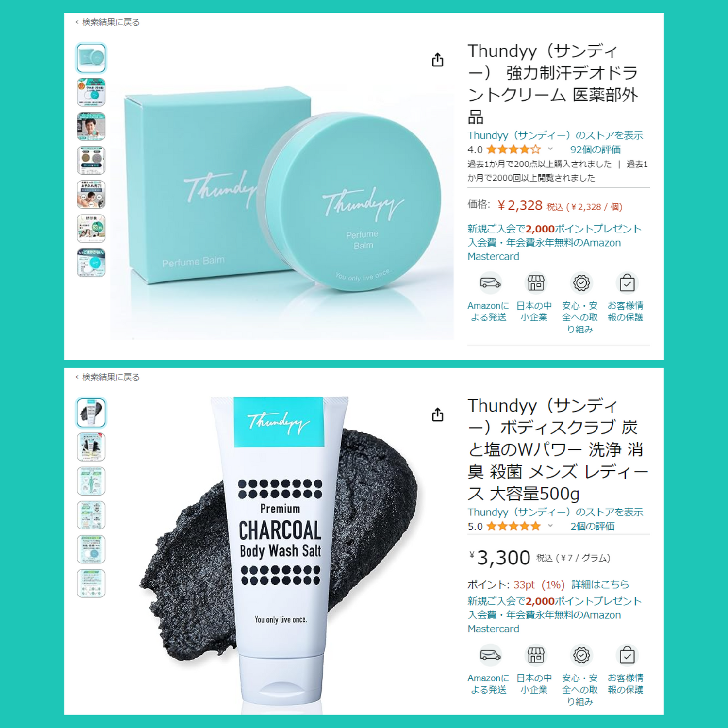 特別割引価格の「お得定期便」コースは本オフィシャルオンラインストアでのみお申込みいただけますが、Thundyy(サンディー)ブランドのアイテムはAmazonでもお買い求めいただけます。